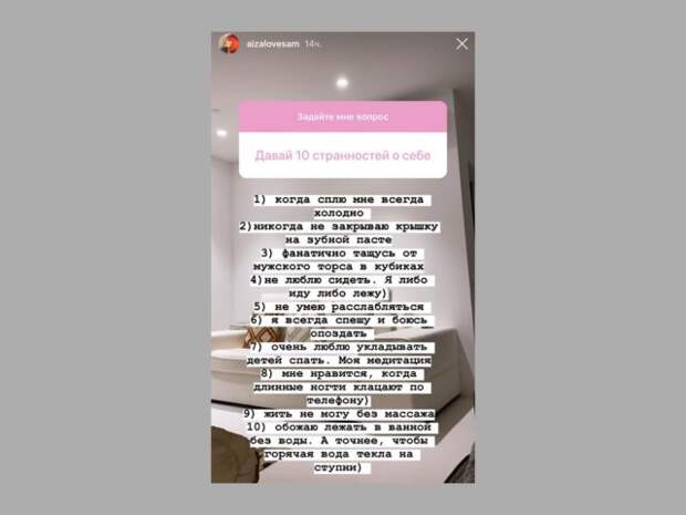 И вот, ее попросили рассказать «странности о себе»: так мы узнали, что Айза мерзнет во сне, никогда не закрывает крышку от зубной пасты, «тащится» от мужского торса с кубиками, не любит сидеть, всегда боится опоздать, не может жить без массажа, обожает укладывать детей спать и лежать в ванне без воды.