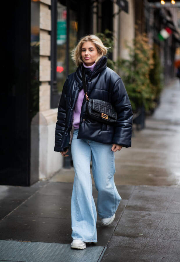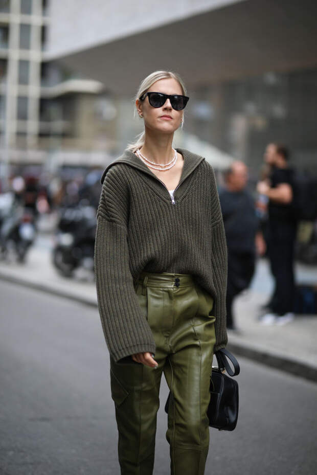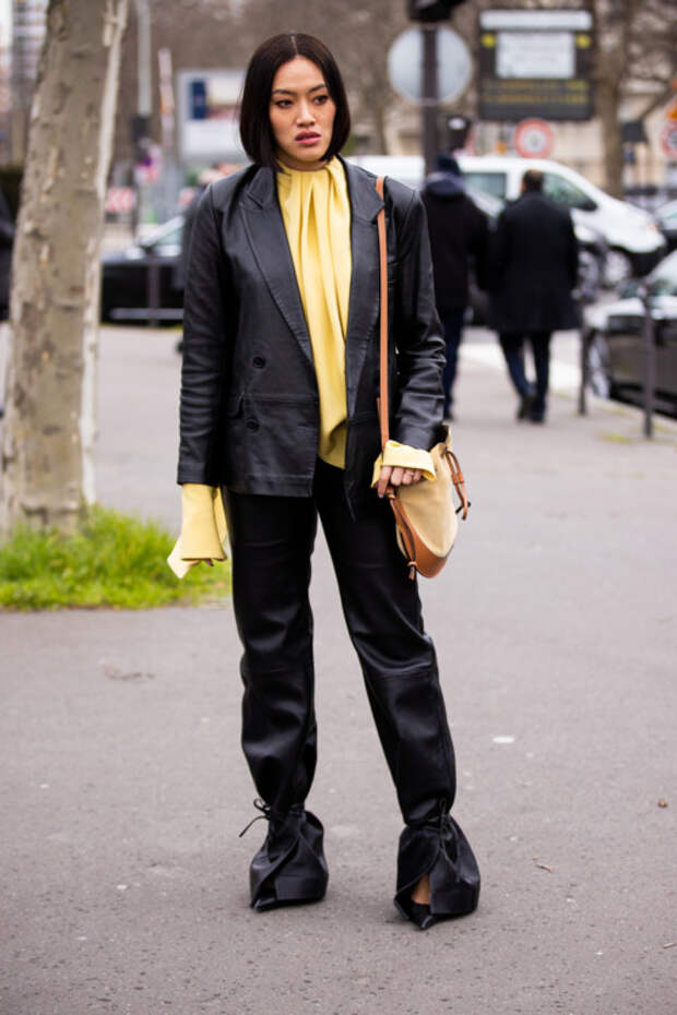 Отложи платье на дальнюю полку и смело надевай брюки или джинсы. Дополни образ кожаной рубашкой, жакетом или оверсайз бомбером.