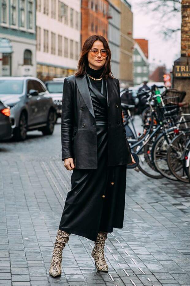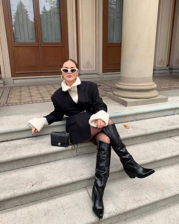 Если ты все-таки решила надеть платье, то, пожалуйста, забудь про мюли и лодочки. Они будут выглядеть неуместно. Лучше всего выбрать высокие сапоги. В идеале остановиться на кожаных моделях. Кстати, носить их можно не только с платьями, но и с брюками.